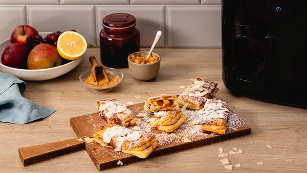 Mix 1 tsp cinnamon with vanilla sugar. Sprinkle the turnovers with the cinnamon sugar mixture. Place them in the basket of the Bosch Air Fryer and bake at 180°C for 8-10 minutes until crispy.